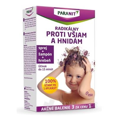 V balení Paranit Radikálny sprej nájdete navyše šetrný šampón po ošetrení pre ľahké vymytie silikónových olejov a hustý hrebeň všiváčik, ktorým zahubené vši a hnidy z vlasov vyčešte. Viac na adc.sk