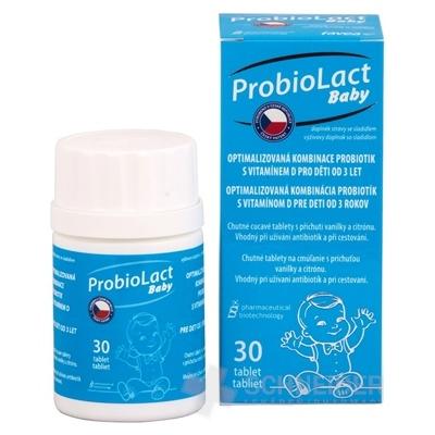 Výživový doplnok. Tablety na cmúľanie s príchuťou vanilky a citrónu ProbioLact Baby obsahujú vyvážený komplex 10 probiotických kmeňov živých mikroorganizmov v celkovom počte 2 miliardy v tablete a vitamín D. Prípravok je určený pre deti od 3 rokov.