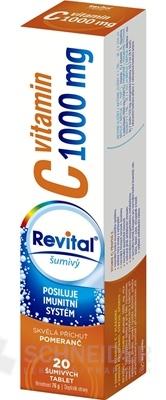 Výživový doplnok Revital® vitamín C 1000 mg šumivý s príchuťou pomaranč - tablety s obsahom vitamínu C. Výrobok obsahuje 1000 mg vitamínu C (kyselina L-askorbová) a 120 mg inulínu - vlákninu z čakanky.