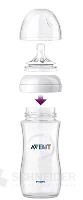 Univerzálna fľaša. Dojčenská fľaša s extra cumlíkom AVENT Natural so stredným prietokom (3 otvory v cumlíku). Fľaša je vyrobená z polypropylénu (PP), ktorý je polopriehľadný a mliečnej farby. Neobsahuje BPA (Bisfenol A).