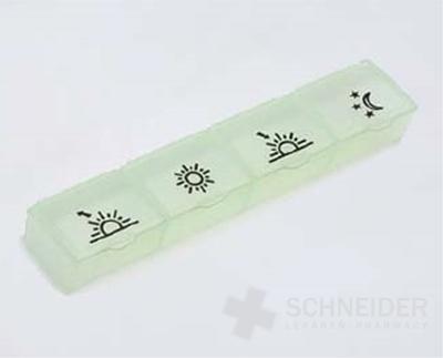 Každý deň je rozdelený na 4 časti: ráno x obed x večer x noc. Veľkosť dávkovača: 110 x 22 x 20 mm.