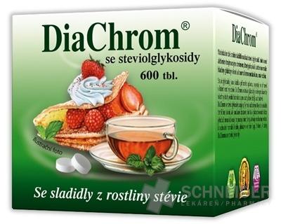 DiaChrom - nízkokalorické stolové sladidlo na báze glykozidov steviolu (E 960) a s aktívnym trojmocným chrómom, ktorý prispieva k udržaniu normálnej hladiny glukózy v krvi a k správnej látkovej premene makronutrientov (min 6 mikrogramov Cr/deň tj. 4 tabletky sladidla). Sladidlo má čistú sladkú chuť s neskorším nástupom sladkosti a dlhšie pretrvávajúcim sladkým efektom bez nepríjemných pachutí. Je dobre rozpustné vo vode a jeho prednosťou je, že zvýrazňuje chuť kávy.