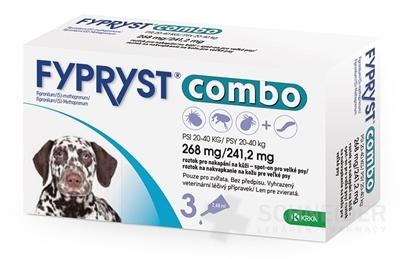 FYPRYST combo 268 mg/241,2 mg roztok na nakvapkanie na kožu pre veľké psy (od 20 kg do 40 kg). Obsahuje kombináciu dvoch účinných látok: fipronilu a metoprenemu. Roztok sa nachádza v pipetách, pričom každá pipeta obsahuje: