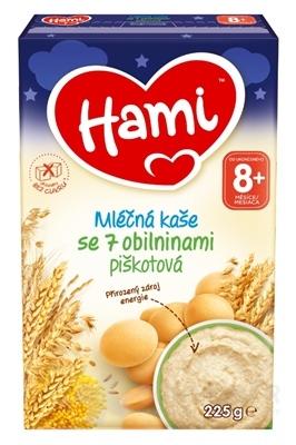 Potravina na báze obilia určená pre dojčatá a malé deti od ukončeného 8. mesiaca, v prášku. Jedna porcia kaše denne tak pomáha postupne zavádzať nové chute obilnín či ovocia a vytvárať zdravé stravovacie návyky. Hami mliečna kaša so 7 obilninami piškótová bez pridaného cukru (obsahuje prírodné cukry) je vhodná na večeru alebo raňajky.