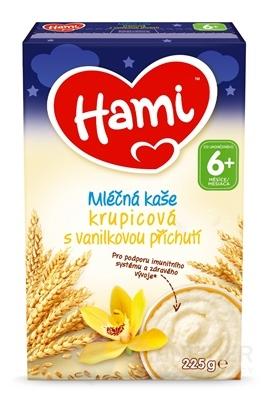 Potravina na báze obilia určená pre dojčatá a malé deti od ukončeného 6. mesiaca, v prášku. Obsahuje obilniny (pšeničnú krupicu), ktoré su prirodzeným zdrojom energie. Jedna porcia kaše denne tak pomáha postupne zavádzať nové chute obilnín či ovocia do jedálnička a podporuje imunitný systém a zdravý vývoj dieťaťa. Hami mliečna kaša krupicová s vanilkovou príchuťou je vhodná na večeru alebo raňajky.