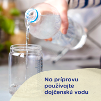 2. Prevarte pitnú vodu vhodnú pre deti a nechajte ju vychladnúť napr. vo vodnom kúpeli na 40 °C. Vlejte požadované množstvo do vysterilizovaného hrnčeka či hrnčeka s náustkom (dávkovanie - pozri tabuľku). Nespotrebovanú prevarenú vodu už na ďalšiu prípravu mlieka nepoužívajte.