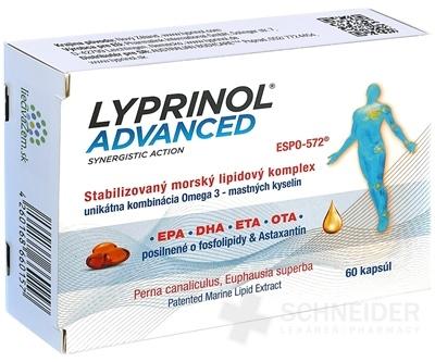 Lyprinol ADVANCED® - vysokočistý a stabilizovaný ESPO-572® lipidový komplex (50 mg účinnej zložky v 1 cps / PernaCanaliculus, Euphausia superba, Astaxantín ). Vo svojej aktívnej frakcii obsahuje kombináciu špecificky synergických morských lipidov s vysokým podielom Omega-3 -polynenasýtených mastných kyselín (OTA, DHA, ETA, EPA), získaných z novozélandskej lastúry zelenej a krillu stabilizovaným patentovaným procesom. Viac na adc.sk
