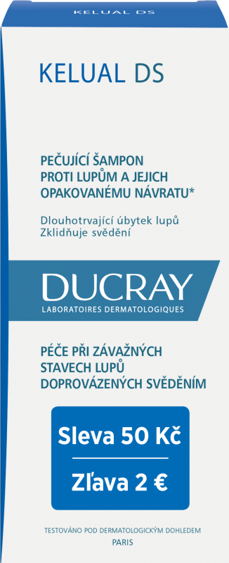 Kelual DS šampón je vhodný na závažné a recidivujúce formy lupín so začervenalou a svrbiacou vlasovou pokožkou. Jeho komplexné zloženie pôsobí proti všetkým faktorom, ktoré sa podieľajú na vzniku závažných foriem lupín: kyselina beta β-glycyrretínová poskytuje okamžitú a dlhotrvajúcu úľavu od svrbenia a začervenania, Cyklopiroxolamín a pyritión zinku účinne pôsobia proti kvasinkám malassezia, ktoré sa podieľajú na vzniku lupín, zabránením ich množenie. Keluamid odstraňuje lupiny a čistí vlasovú pokožku. Výsledky: Upokojenie svrbenie od prvého použitia. Odstránenie začervenania a lupín s dlhodobým účinkom. Vaša vlasová pokožka je rýchlo upokojená a bez lupín.