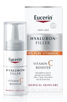 Vitamín C je silný antioxidant, ktorý neutralizuje voľné radikály a posilňuje vlastný obranný systém pleti. Je taktiež nevyhnutný pre tvorbu kolagénu v kožných bunkách, ktorý pomáha podporovať štruktúru pleti a oddialiť známky starnutia. Inovatívne balenie umožňuje čerstvo aktivovať vitamín C pri prvom použití. Stačí stlačiť a zmiešať vitamín C v prášku s emulziou obsahujúcou nízkomolekulárnu kyselinu hyalurónovú a licochalcon A. Výrobok je najúčinnejší počas 21 dní. Nízkomolekulárna kyselina hyalurónová je účinná hydratačná zložka, ktorá vypĺňa vrásky v epidermálnej (vrchnej) vrstve pleti. Ďalší osvedčený antioxidant, licochalcon A, účinkuje spoločne s vitamínom C a neutralizuje voľné radikály vyvolané UV žiarením a vysokoenergetickým viditeľným svetlom. Eucerin Hyaluron-Filler Vitamin C Booster je vhodný na všetky typy pleti a je klinicky a dermatologicky preukázané, že posilňuje pleť a vypĺňa vrásky. Pleť je hladšia, sviežejšia a žiarivejšia už po 7 dňoch a výsledky sa postupom času aj naďalej zlepšujú.