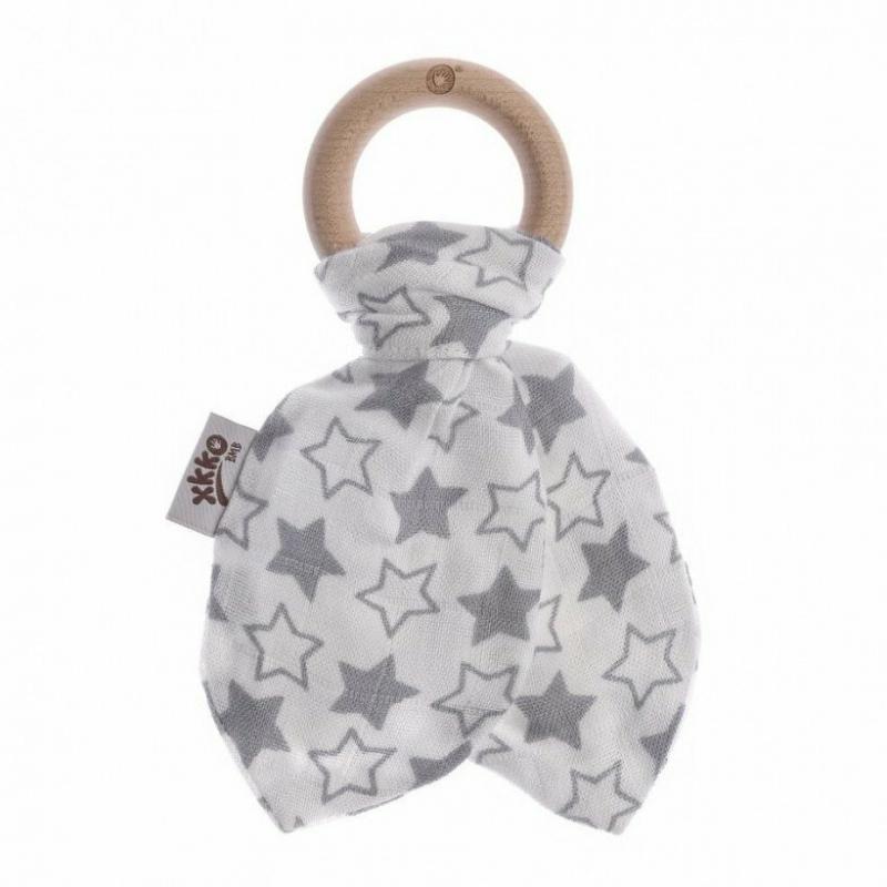 Drevené hryzátko XKKO BMB so šuštivými lístkami z extrémne jemného bambusového mušelínu. Bambusová viskóza je antibakteriálna a nespôsobuje žiadnu alergickú reakciu.