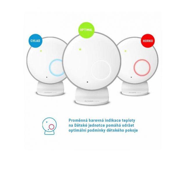 Monitor má vstavaný teplomer, ktorý meria aktuálnu teplotu v miestnosti, kde je dieťa. Farebný indikátor na Detskej jednotke upozorní, či je teplota v izbe príliš vysoká, nízka, alebo sú tam nastavené ideálne podmienky pre dieťa.