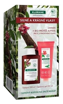 KLORANE set: šampón pre silné a krásne vlasy, s chinínom a Bio plesnivcom alpínskym proti vypadávaniu vlasov a sprchový gél s ibištekom.