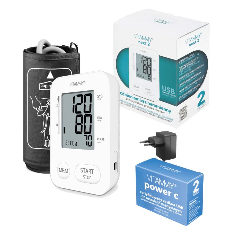 Vyberte si svoj nový, dokonale padnúci tlakomer z najkompletnejšej série VITAMMY NEXT. Elektronický ramenný tlakomer Vitammy Next 2, ktorý bude užitočný v každej domácnosti. Vitammy Next 2 má množstvo užitočných funkcií, ktoré uľahčujú presné meranie krvného tlaku doma bez toho, aby ste museli navštíviť ordináciu. Potreba kontrolovať svoj krvný tlak každý deň uľahčuje starostlivosť o seba v každom veku. Meranie krvného tlaku je jedným z prvkov starostlivosti o stravu, vitalitu a zdravie. Meranie tlaku sa robí oscilometrickou metódou, ktorá spočíva v skúmaní zmien tlaku spôsobených nafúknutou meracou manžetou.