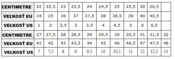 Nameranú dĺžku chodidla, prosím, porovnajte s našou tabuľkou veľkostí, ktorá je k dispozícii pri každom produkte. V prípade akýchkoľvek nejasností alebo potreby asistencie pri výbere správnej veľkosti, neváhajte sa na nás obrátiť. Radi Vám s výberom pomôžeme.