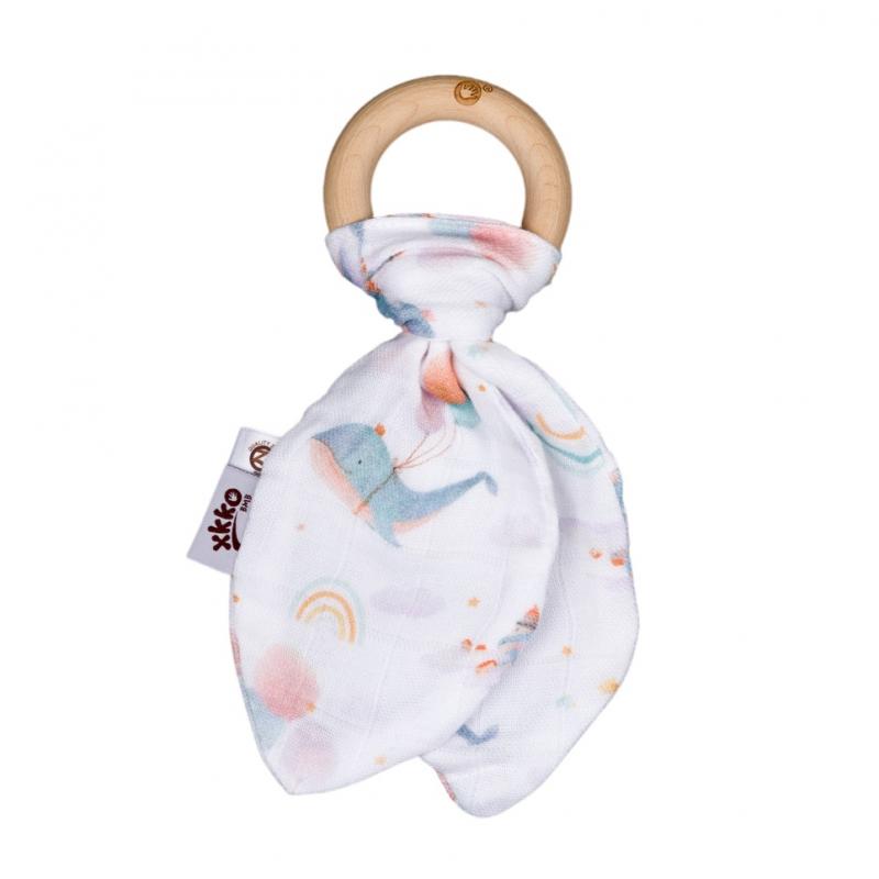 Drevené hryzátko XKKO BMB so šuštivými lístkami z extrémne jemného bambusového mušelínu. Bambusová viskóza je antibakteriálna a nespôsobuje žiadnu alergickú reakciu.