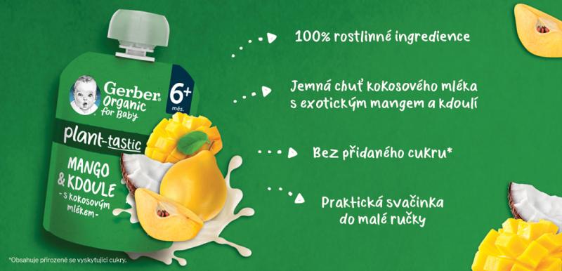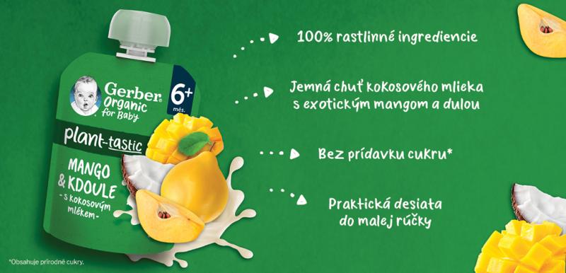 GERBER Organic ovocná kapsička mango a dula s kokosovým mliekom predstavuje jedinečnú desiatu plnú najkvalitnejšieho ovocia. Kapsička obsahuje pyré zo zrelých kúskov manga a dulí, čo jej dodáva prirodzene sladkú chuť. V kombinácii s jemným kokosovým mliekom ovocná desiata pohladí jazýček malého jedáka. Vďaka 100% rastlinným zložkám si túto lahodnú desiatu môžu vychutnať aj jedáci citliví na laktózu. Kapsička je určená pre deti od ukončeného 6. mesiaca. - Na báze rastlinných ingrediencií, ovocia a kokosového mlieka, bez prídavku živočíšneho mlieka - 100% rastlinné ingrediencie - Jedinečná príchuť exotického manga s dulou - Jemná chuť kokosového mlieka - Bez prídavku cukru - Praktické uzatvárateľné balenie - Praktická desiata do malej rúčky - Ovocie od BIO certifikovaných farmárov, ktorí rešpektujú prirodzený poriadok prírody - Obsahuje prírodné cukry S kapsičkami GERBER Organic Plant-tastic máte vždy po ruke chutnú desiatu, v ktorej sa kombinuje prirodzená chuť ovocia s jemným kokosovým mliekom. Ovocné kapsičky nájdete v jedinečných exotických príchutiach – mango & broskyňa a mango & dula. Pri výrobe sme naviac nepridali cukor, prirodzene sladkú chuť dodáva zrelé ovocie. Obal je navrhnutý ako recyklovateľný a je tak šetrnejší k životnému prostrediu. GERBER Organic rovnako ako mamička dohliada na to, aby každé vrecúško obsahovalo len to najlepšie ovocie plné skutočnej chuti. Aby sme zabezpečili prvotriednu kvalitu pre vašich najmenších, spolupracujeme s farmármi z certifikovaných organických fariem, kde sa berie ohľad na prirodzený spôsob pestovania a dozrievania všetkých plodín. Zloženie: Pitná voda, pyré z manga 25 %, pyré z dulí 20 %, kokosové mlieko 15 % (pitná voda, kokosový extrakt 7 %), celozrnná OVSENÁ múka, PŠENIČNÉ vločky, regulátor kyslosti: kyselina citrónová. z ekologického poľnohospodárstva. ALERGÉNY SÚ ZVÝRAZNENÉ VEĽKÝM PÍSMOM Upozornenie: Nenechávajte uzáver v blízkosti dieťaťa! V prípade mechanického poškodenia vrecka nepoužívajte! Neohrievajte v mikrovlnke. Použitie: Deti mladšie ako 12 mesiacov: Odstráňte uzáver, obsah vytlačte na lyžičku a dieťa kŕmte v sede. Majte dieťa pod stálym dohľadom. Deti staršie ako 12 mesiacov: Môžu jesť samé, pokiaľ sedia a sú pod stálym dohľadom. Skladovanie: Skladujte v suchu pri izbovej teplote. Po otvorení skladujte v chladničke max. 24 hodín. Výživové údaje: Energie / Energia 290 kJ / 69 kcal Tuky 2,8 g - z toho nasycené / nasýtené mastné kyseliny 2,2 g Sacharidy 9 g - z toho cukry 5,5 g Vláknina 2 g Bílkoviny / Bielkoviny 1 g Sůl / Soľ 0,01 g Distribútor: Nestlé Slovensko s.r.o. Košovská cesta 11 971 27 Prievidza Slovenská republika Tel.: 0800 135 135 Výrobca: Poľsko – Rzeszow