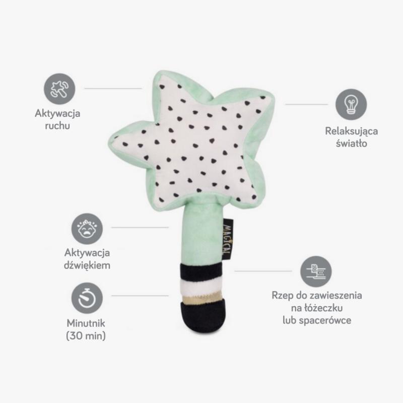 Čarovná palička v tvare hviezdy je ideálnym spoločníkom pre vaše dieťa, pretože jej mäkké, relaxačné svetlo poskytuje pocit bezpečia a pohodlia v tme, čím pomáha vašim deťom zbaviť sa strachu z tmy.