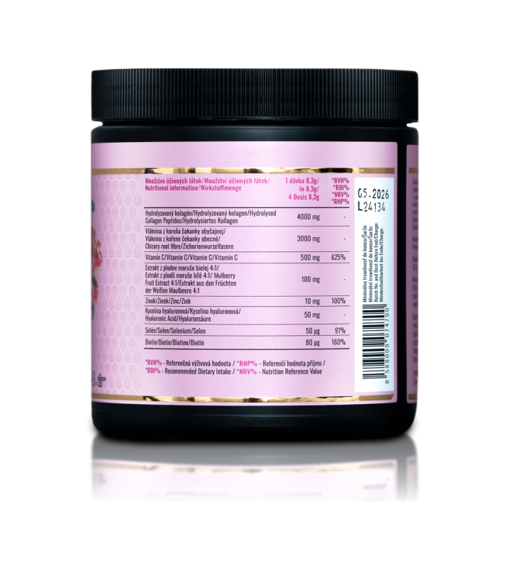 Extrakt z moruše bielej, vitamín C, Selén, Zinok, kyselina hyalurónová a biotín: