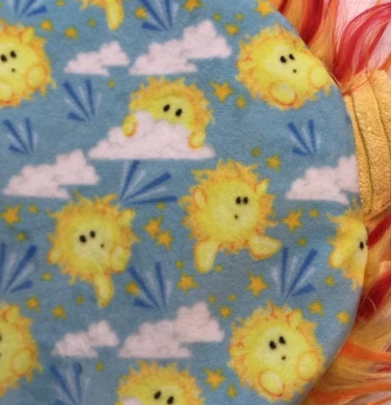 Predná strana prívesku má klasický vzor Slnka, zatiaľ čo zadná strana je pokrytá jemným, príjemným flanelom s vlastnou potlačou Slnka a oblohy. Táto kombinácia rôznych textúr a vizuálnych podnetov podporuje zmyslový rozvoj dieťaťa.