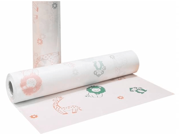 Táto podložka sa dodáva vo forme 50 metrov dlhej rolky s šírkou 50 centimetrov. Je vyrobená z bielej fólie, ktorá je z jednej strany laminovaná čistou celulózou potlačenou detským vzorom, čím kombinuje nepremokavosť a príjemný povrch. Kľúčovým prvkom je perforácia každých 38 centimetrov, ktorá umožňuje jednoduché a rýchle odtrhnutie jednotlivých častí s rozmermi 50 cm x 38 cm.