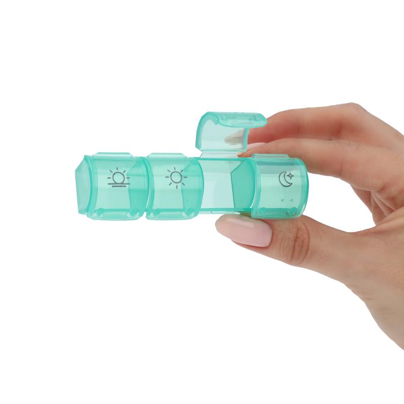 Jeho kompaktné rozmery (rozmery jedného puzdra na deň sú 9 x 2,5 cm, celkové rozmery puzdra na týždeň sú 19,5 x 11 x 3 cm) znamenajú, že sa bez problémov zmestí do kabelky, kufra alebo zásuvky. Je to ideálna voľba na cestovanie, do práce alebo na rušný deň, keď potrebujete mať svoje lieky poruke.