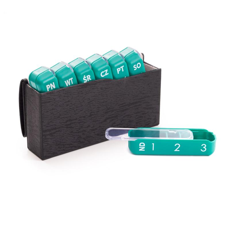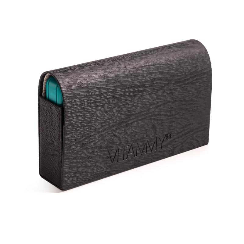 Všetky krabičky dávkovača VITAMMY PILLA FLEX sú uložené v elegantnom puzdre, ktoré pripomína kožu a má moderný dizajn. Toto puzdro nielenže spoľahlivo chráni vaše lieky, ale tiež dodáva celému organizéru esteticky príjemný a diskrétny vzhľad.