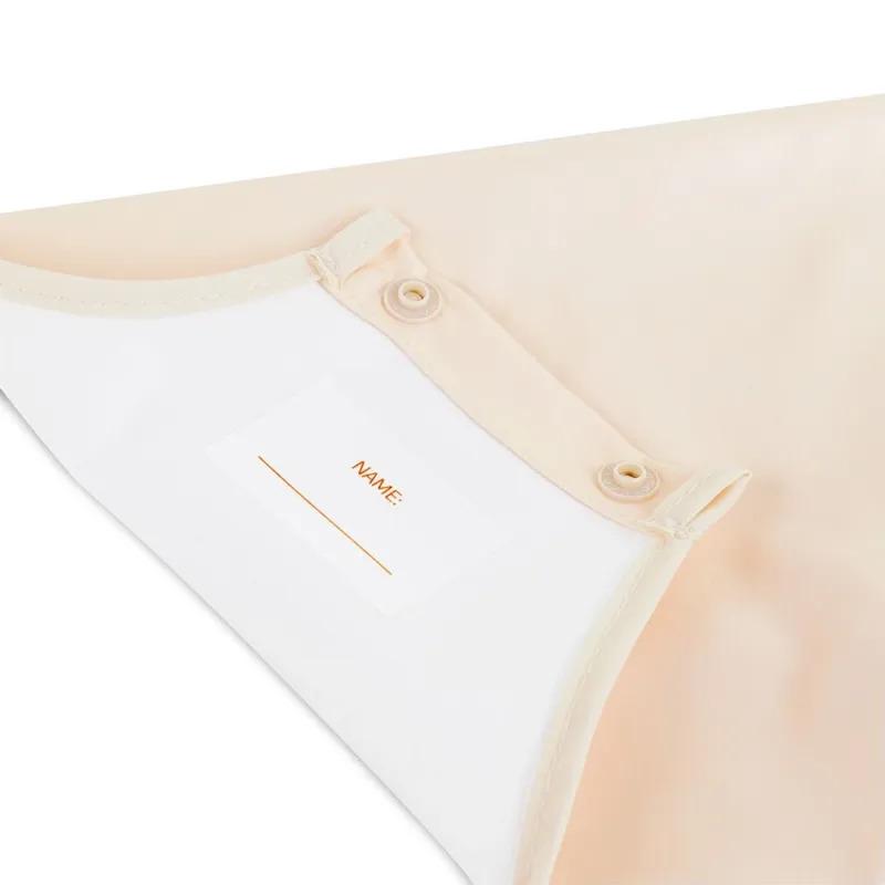 Vďaka vstavanému vrecku na omrvinky a zvyšky jedla je upratovanie po jedle oveľa jednoduchšie. Materiál je vodeodolný a ľahko sa čistí – stačí ho utrieť vlhkou handričkou, opláchnuť pod tečúcou vodou alebo ho jednoducho vyprať v práčke. Pre dokonalé prispôsobenie má podbradník nastaviteľnú sponu a na štítku je vyhradené miesto na meno dieťaťa, čo je praktické najmä pre použitie v jasliach alebo škôlke.