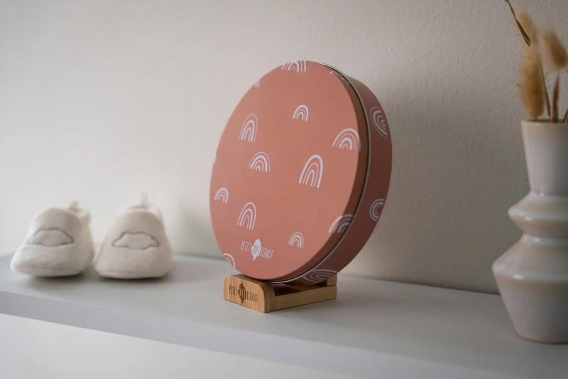 Petit Artichaut Okrúhla Krabička na Odtlačok je elegantný a emotívny suvenír, ktorý kombinuje bezpečný, hypoalergénny íl s jedinečným okrúhlym dizajnom. Vďaka priloženému drevenému stojanu sa táto pamiatka stáva trvalou a krásnou dekoráciou, ktorá štýlovo pripomína tie najkrajšie chvíle v živote vašej rodiny.