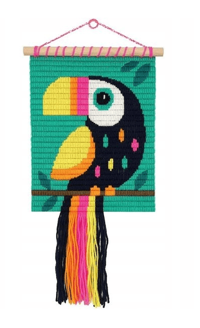 Kompletný set na tvorenie: V balení nájdete všetko potrebné – od bohatej sady farebných priadzí až po drevenú tyč, na ktorú si hotové dielo zavesíte.